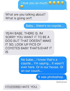 Justin Bogh, her husband, notwithstanding, couldn't trust his eyes when he saw what his better half was up to and messaged her back quickly calling attention to what she did — that she hadn't brought home a destitute, frightened puppy, however a coyote! What takes after is a humorous discussion that sees the spouse going crazy, while the wife appears to have lost it totally!